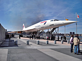We were kinda surprise that the Concorde is actually very very slim. It has a max cruise speed of 1,350 mph (mach 2.04) and a cruising altitude of 60,000', high enough for it's passengers to see the curvature of the earth!! It's about 203' in length and a wingspan of 83'. The Concorde is powered by four Rolls Royce/SNECMA Olympus 593 engines and is capable of covering 3,900 nautical miles without refueling. An interesting fact that we learned while we were there was the Concorde expands approximately 8 inches during flight due to friction heating. Wow! I didn't know that.