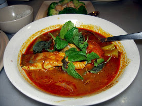 We had two choices for our curry dish. We could choose between the Assam Curry Fish (a spicy sourish kind of curry) or Lemak Curry Fish (coconut based, thus making it creamier). Both the curries would be yummy but we went with the Assam Curry because Penang is more well known for it's Nyonya style Assam Curries. The curry was awesome, with really fresh fish and vegetables (onions, tomatoes, okra, lemongrass..etc). It was also served with some fresh mint on top. Boy, it tasted so good with the steamed rice. Yummy!